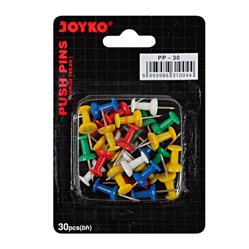 Joyko Push Pin PP-30 adalah jenis jarum tekan (paku pin) yang umum digunakan untuk menempelkan dokumen, catatan, atau gambar pada permukaan seperti papan mading (softboard), gabus (cork board), atau styrofoam.